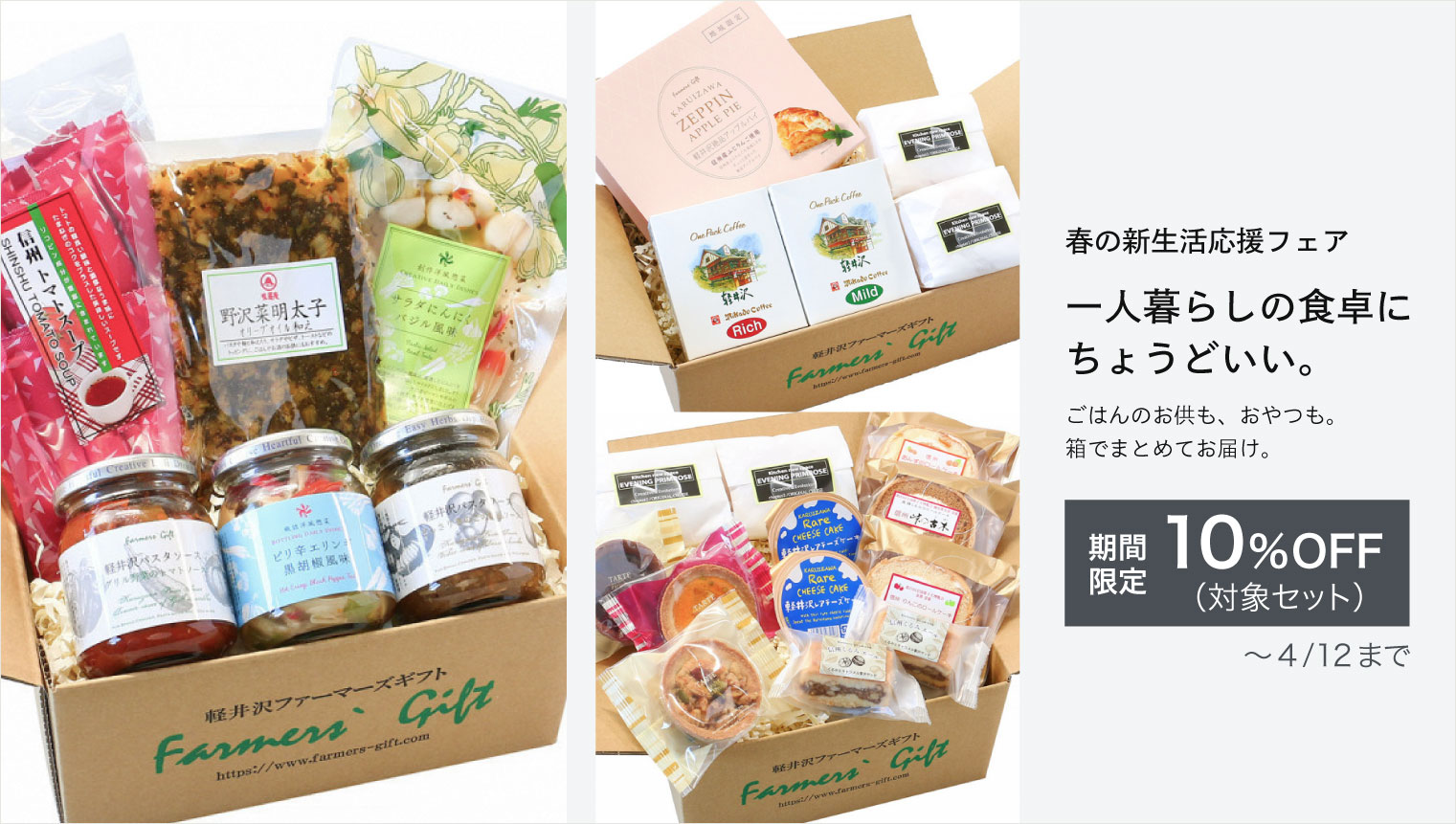 軽井沢ファーマーズギフトからのお知らせ AmazonPayがご利用いただけるようになりました。 ふるさと納税の返礼品に出品いたしました。 定番商品 フルーツソース 野沢菜昆布 ジャム スイーツ ベストセラー 具マヨ 青しそツナチーズ フルーツソース フルーツミックス(大瓶) 野沢菜昆布【冷蔵品】 ご飯によく合う和食セット フルーツソース3本セット 新着商品 しじみのみそ汁 8P 海老と蟹のビスク 和風仕立て たっぷりねぎの鶏だし生姜スープ 混ぜご飯の素 菜の花しめじご飯 『炉ばたのおやき』おまかせ6個詰め合わせ【要冷凍】送料無料 オニオングラタンスープ こだわり素材のとろとろスープ 商品カテゴリ ギフトセット フルーツソース ジャム スイーツ ドレッシング マヨネーズ・ソース スナック・おつまみ ジュース スープ お漬物 洋風惣菜 和風惣菜 調味料 信州名産・銘菓 手提げ袋・ラッピング ギフト ご予算から選ぶ ~1,000円 ~2,000円 ~3,000円 ~4,000円 ~5,000円 ~6,000円 6,001円~ 用途で選ぶ 結婚祝い・内祝い 出産祝い バースデー プチギフト 香典返し・ご法要 ギフトセット一覧 店舗案内 店舗案内 軽井沢ファーマーズギフトは長野県軽井沢をはじめ、関東エリアに店舗がございます。 店舗一覧 おすすめレシピ おすすめレシピ アレンジ次第で楽しみ方が広がる!スタッフおすすめレシピをご紹介! レシピ一覧 お知らせ/メディア掲載 2025/12/18 AmazonPayがご利用いただけるようになりました。 2025/11/14 ふるさと納税の返礼品に出品いたしました。 2025/09/11 「軽井沢 ミカド珈琲ラング・ド・シャ」「ミカド珈琲 レーズンサンド」の販売取扱いを開始いたしました。 2024/12/11 ムック本「ニッポンの美味お取り寄せの世界」掲載 2024/10/01 クール便料金/後払い決済手数料 改定(値上げ)のお知らせ
